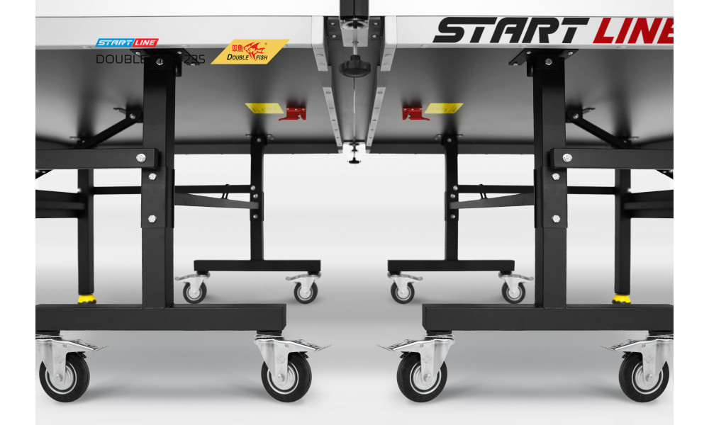 Легкая и удобная настройка рабочей позиции теннисного стола обеспечивается при помощи регулировки высоты стальных боковых опор и восьми поворотных колес. Надежная фиксация всех точек опоры позволяет выставить строго горизонтальный уровень стола на любой поверхности. Модель обладает исключительной устойчивостью и прочностью.